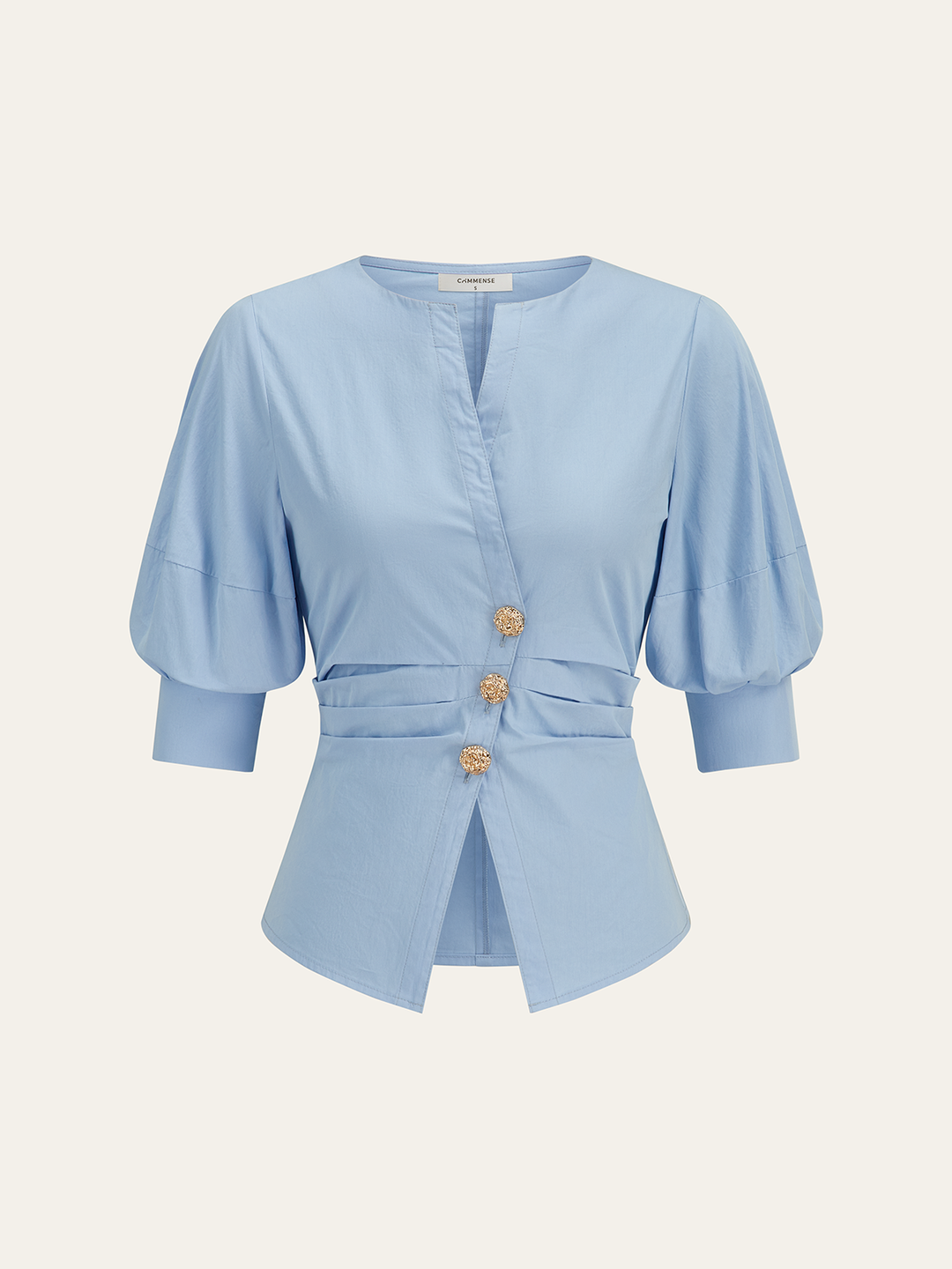 Asimetrik Metal Düğmeli Kabarık Kollu Gömlek Mavi