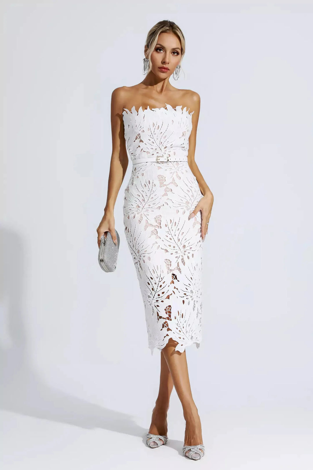 Jazlyn Beyaz Çiçekli Dantel Midi Elbise Beyaz