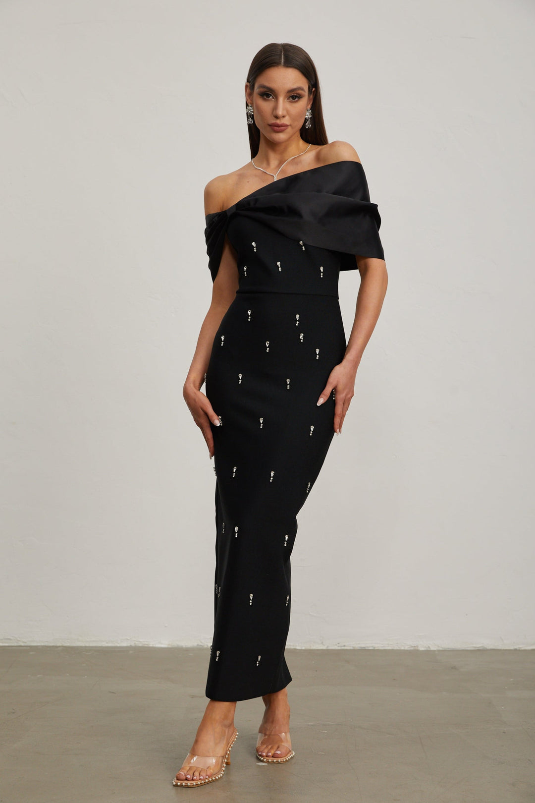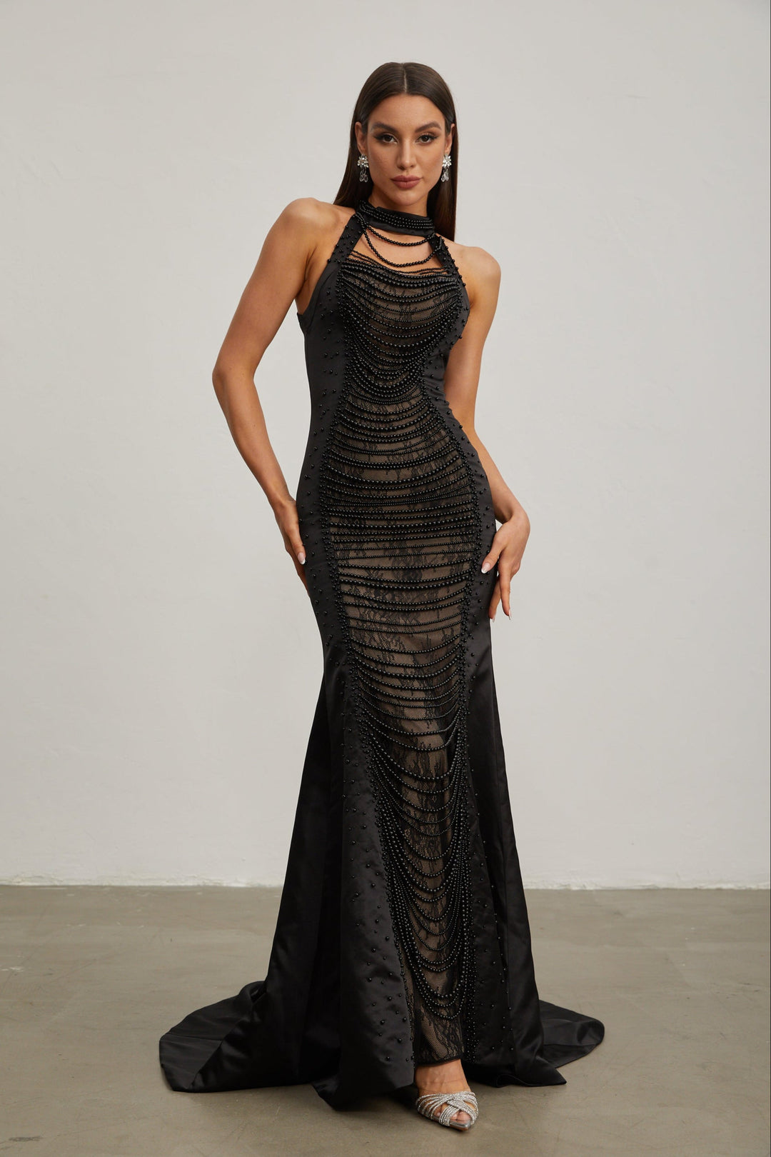Olivia Gece Boncuklu Denizkızı Maxi Elbise Siyah