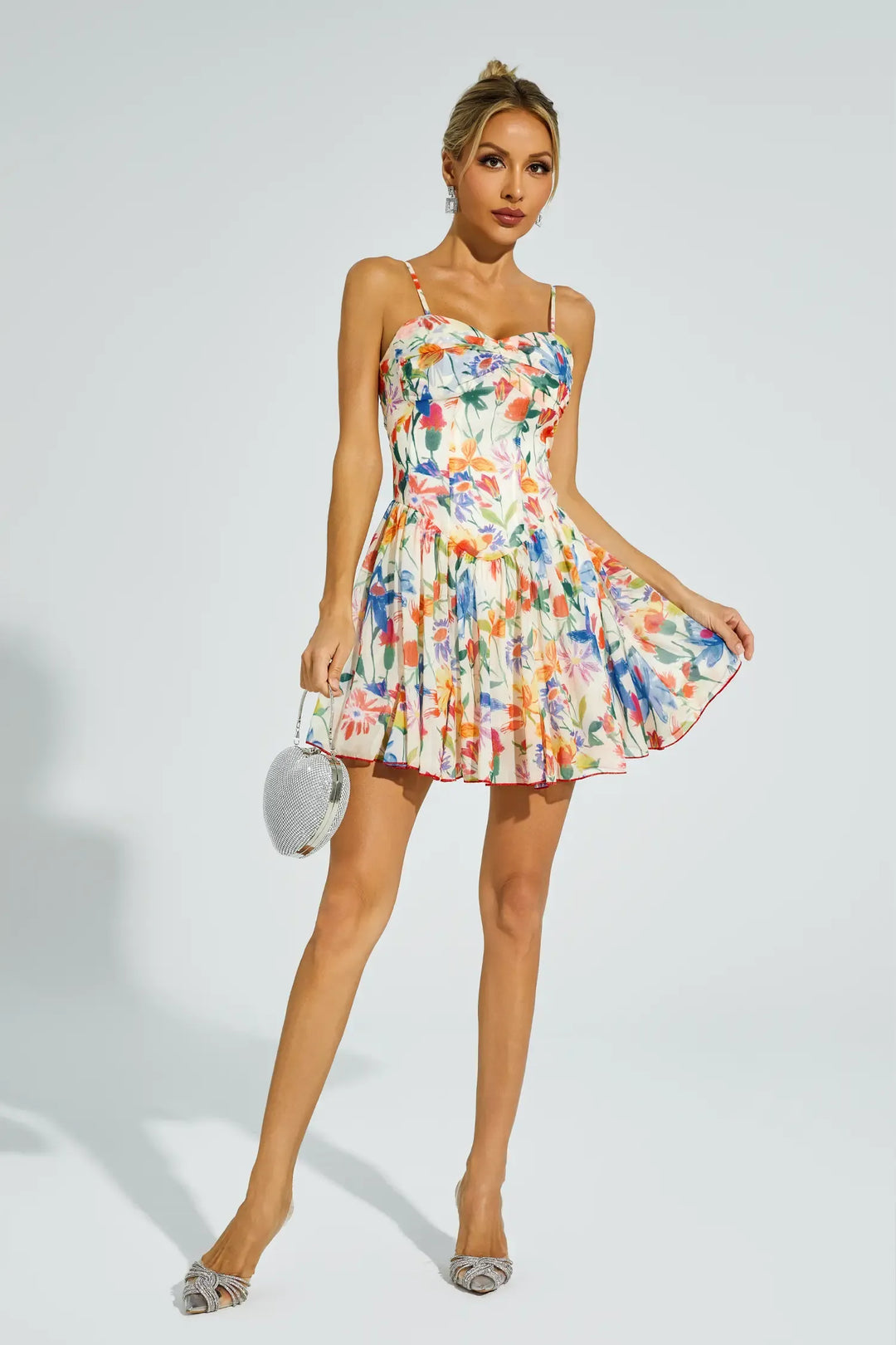 Jimena Turuncu Çiçekli Kısa Elbise Beyaz