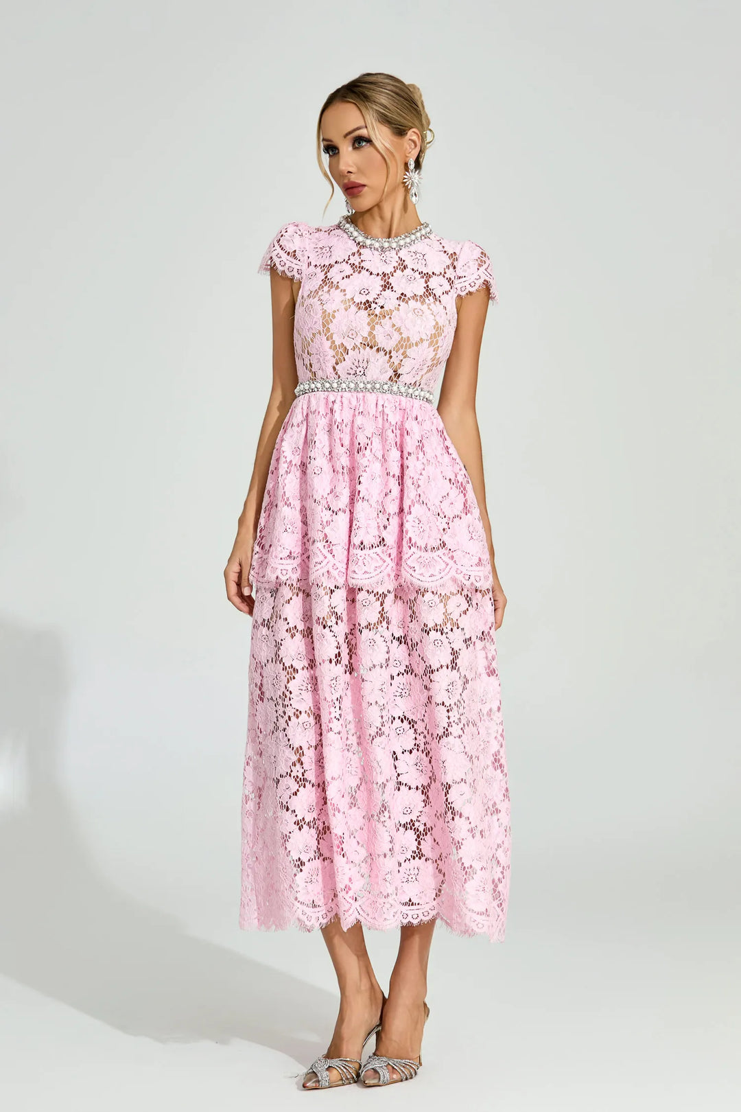 Pembe Rüya Dantel Midi Elbise Pembe