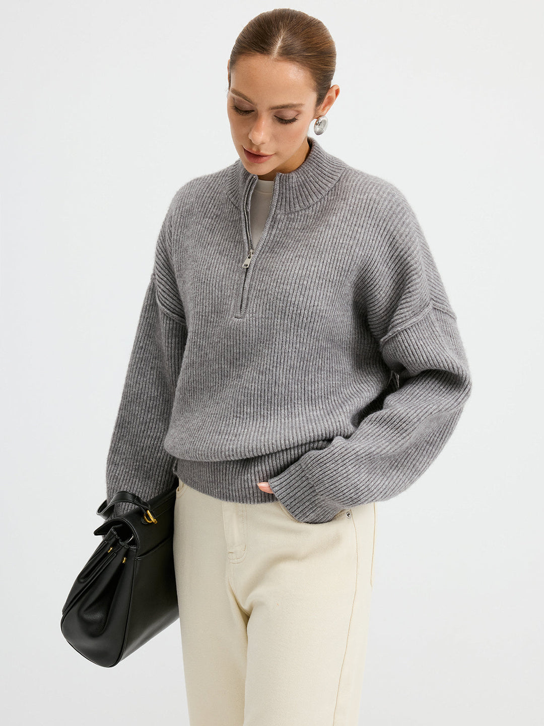 Yün Karışımlı Yarım Fermuarlı Kazak Gri