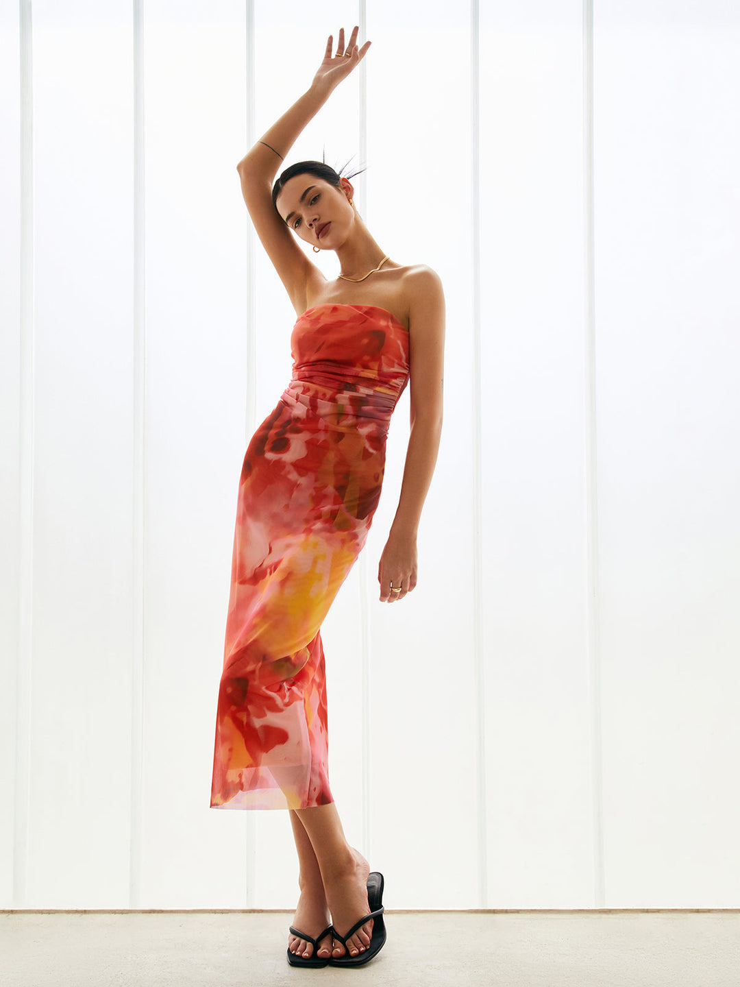 Monet Çiçek Desenli Yırtmaçlı Midi Elbise Çok Renkli