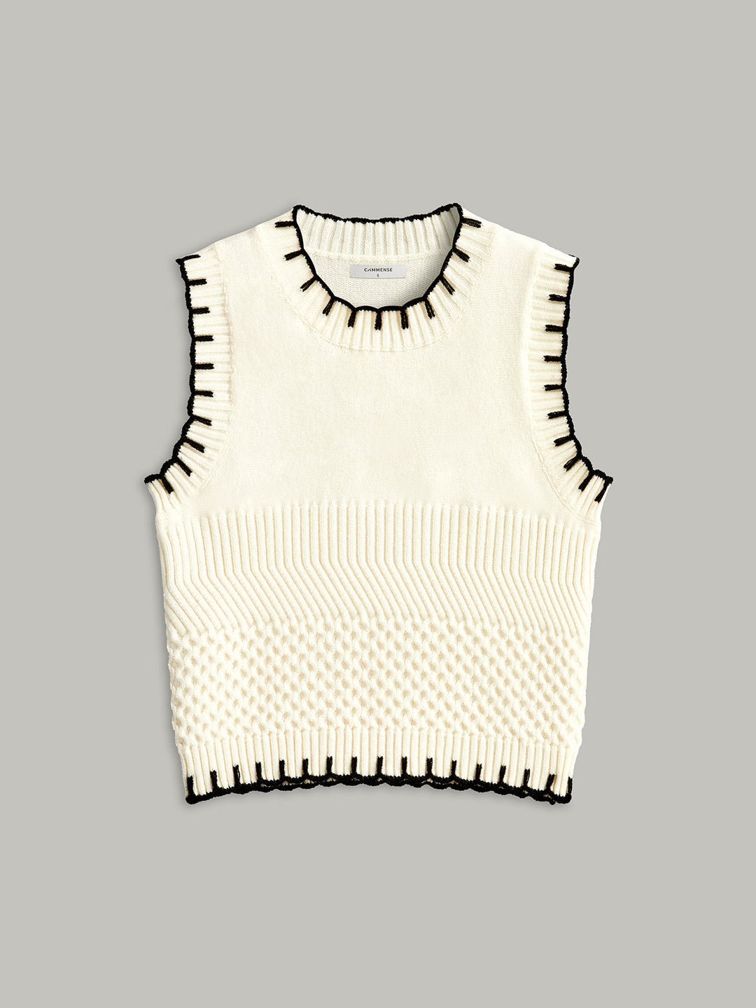 Kontrast Kenarlı Kolsuz Örgü Yelek Beyaz