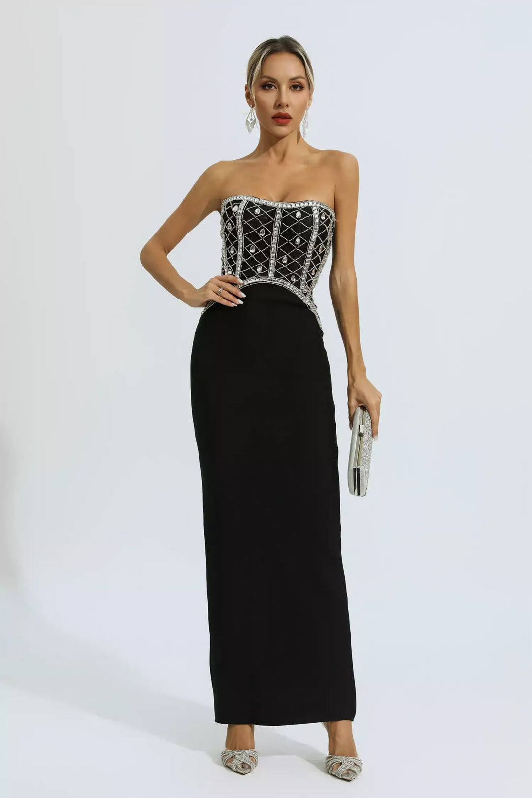 Teresa Siyah Elmaslı Askısız Uzun Elbise Siyah