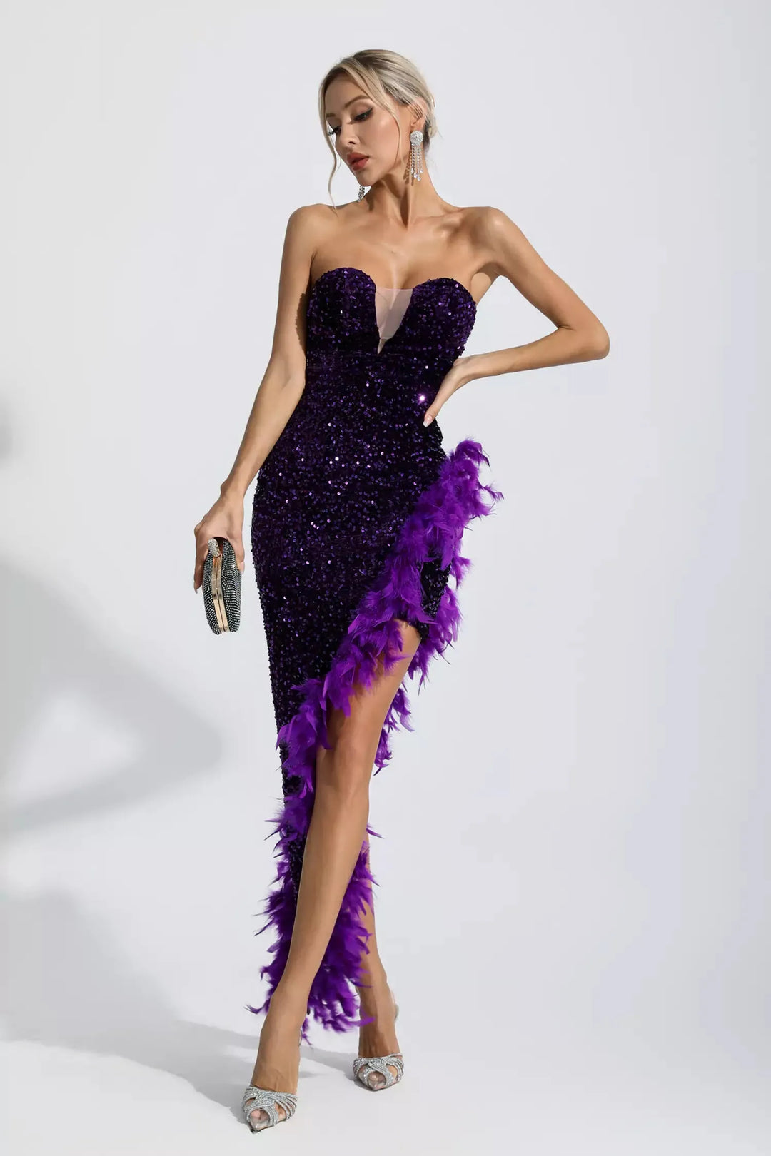 Kira Mor Payetli Tüy Uzun Elbise Mor