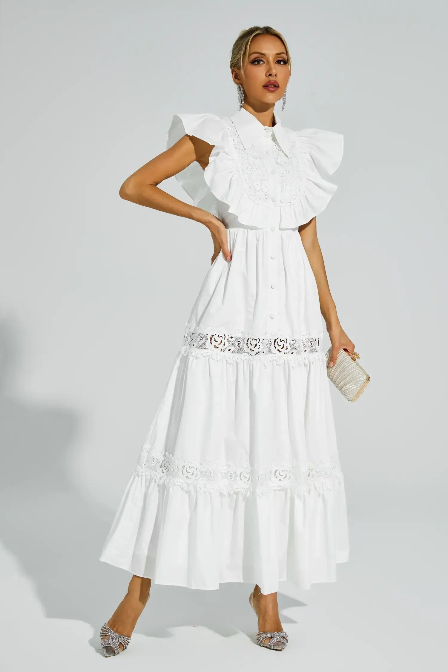 Wesley Beyaz Askısız Volanlı Maxi Elbise, feminenlik ve zarafeti yansıtan muhteşem bir parçadır. Zarif askısız silueti ve şık volan detaylarıyla tasarlanmış bu elbise, her özel etkinlik için mükemmeldir. Karmaşık nakış, sofistike bir dokunuş katarak moda tutkun kadınlar için vazgeçilmez bir parça haline getirir.
