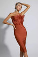 E lianna Koyu Kahverengi Tüy Midi Elbise, hayal gücünün ötesinde, büyüleyici bir elbisedir. Rahat bandaj, straplez tüy detaylı bir beden ile süslenmiş dikişli bir yaka oluştururken, vücuda oturan maxi etek, dar bir belin altında hatlarınızı sarar. Partiye hazır bir görünüm için topuklu ayakkabılar ve bir çanta ile giyin.