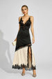 Venelit'in zarafet ve üstün kaliteli dokusunu yansıtan bu elbise, özel anlarınızda etkileyici bir izlenim bırakmanız için tasarlandı. Venelit Siyah Bej Kontrast Dantel Maxi Elbise ile çekici sofistike bir görünüm benimseyin. Bu cazibeli elbise, siyah ve bej renkte şık saten panelleri, zarif dantel kenarlarıyla birleştirir. Derin V yaka ve akışkan siluet, samimi akşam yemekleri, kokteyl partileri veya zarif bir çekicilik yaymak istediğiniz her durum için mükemmel, baştan çıkarıcı ama şık bir görünüm yaratır.