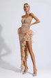 Venelit'in zarafetini taşıyan üstün kalıplı tasarım ile kendinizi özel hissedin; bu parça gecenize parıltı katar. Kira Şampanya Payet Tüy Elbisesi ile bir gece geçirmek, günlerce hayalini kuracağınız bir şey! Bu şık elbise, duyusal çekicilik için V yaka tasarımıyla askısız bir yapıya sahiptir. Parlak payetler güzel bir şekilde parlayarak genel tasarıma bir dokunuş lüks ve ihtişam katıyor. Tüyler, size büyüleyici detaylar sunuyor.