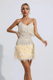 Venelit'in zarafet ve güç veren tasarımlarıyla özel anlarınız için birinci sınıf bir dokunuş elde edin. Lilliana Şampanya Kuş Tüyü Püskül Payet Mini Elbise ile eğlenceli bir gece geçirin! Zarif mini kesimdeki omuzdan askılı elbise. Hassas pembe franjlı payet kumaşından yapılmıştır ve etek ucunda bir halka tüy ile süslenmiştir. Hareket ve durgunluk arasında, büyüleyici bir ışıkla parlıyor.