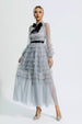 Venelit'in zarafetini taşıyan bu elbise ile iş stilinizde premium bir dokunuş elde edin. İş yerinde rahat ve şık bir elbise mi arıyorsunuz? Neden Venelit Gri Puantiye Maxi Elbise'mizi tercih etmiyorsunuz? Polo yaka kısmında siyah bir fiyonk ve gizem katmak için şeffaf file ile tasarlanmış puantiye desenli kumaştan bir elbise. Şık bir tarza sahip, bu dolap için vazgeçilmez bir elbise.