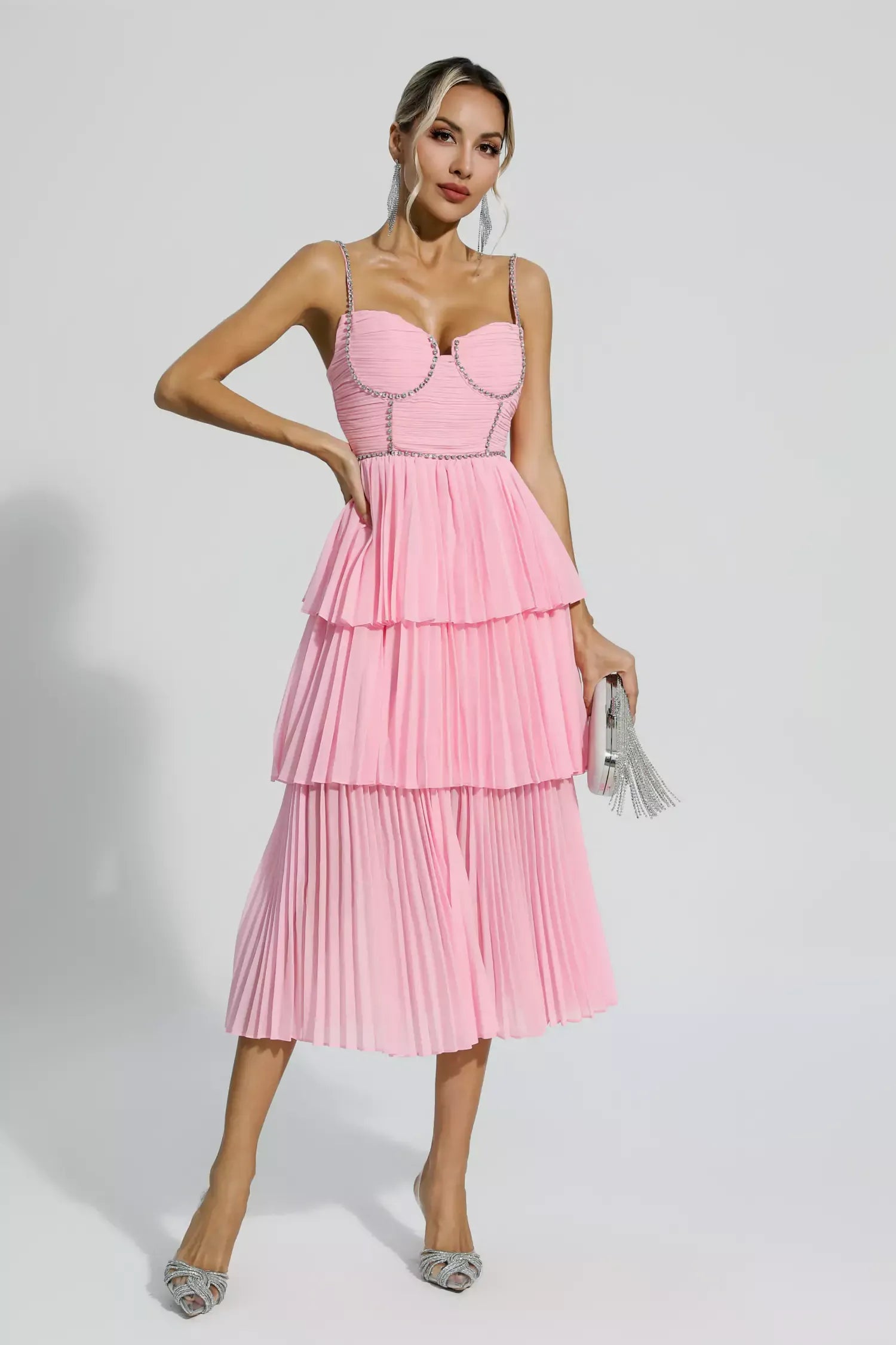 Meredith Pembe Elmas Fırfırlı Midi Elbise, bir sonraki özel etkinliğinizde kalabalığı etkileyecek! Yüksek kaliteli pileli kumaştan kesilmiş, elmas süslemeli askılar, özenle yapılan dikişler ile büyüleyici detaylar sunuyor. Yüksek bel tasarımı ve bol etek, vücut hatlarınızı kolayca vurgular.