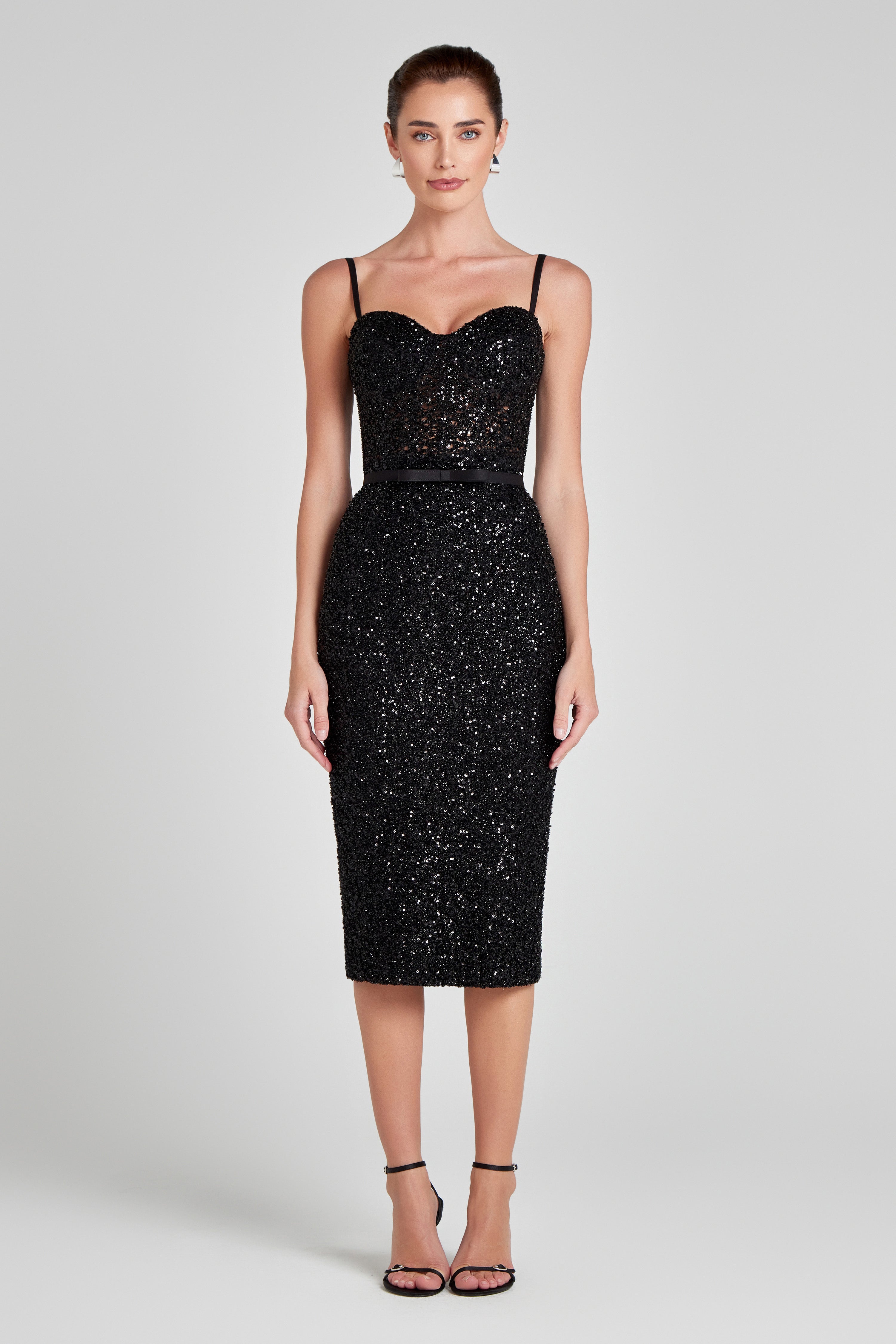 Venelit, süslemeli boncuklu siyah kumaştan yapılmış korsaj tarzı midi elbisesidir. Karmaşık beden detaylarına, ön, arka ve yanlarda iç desteklere ve saten çıkarılabilir askılara sahiptir. Ortada gizli bir fermuar ve çıkarılabilir, ayarlanabilir siyah saten fiyonk kemer ile tamamlanmıştır. Düzgün bir oturuş için tamamen file astarlıdır.
