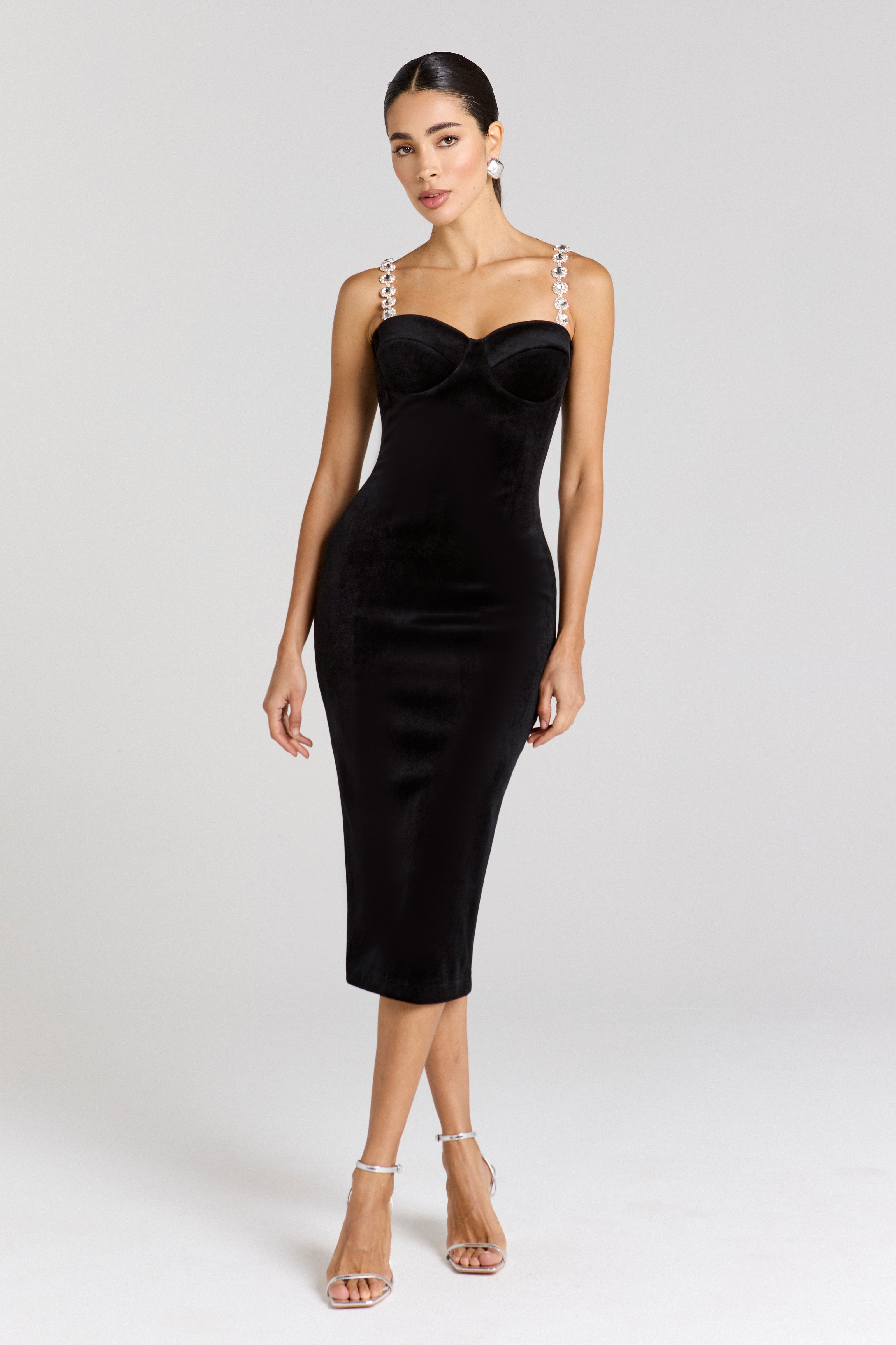 Lüks siyah kadife kumaştan üretilen ELIZA Siyah Elbise, ön, arka ve yanlarda destekli korsaj tarzı bir bodice ve vücuda oturan bir kesim ile sıkı bir siluet oluşturur. Midi etek ucu sofistike bir hava katarken, sökülebilir gümüş taş süslemeleri ile uyumlu bir şıklık sunar. Düzgün bir oturuş için gizli ortadan arka fermuar kapama ile tamamlanmıştır. Konfor ve yapı için tamamen astarlıdır.